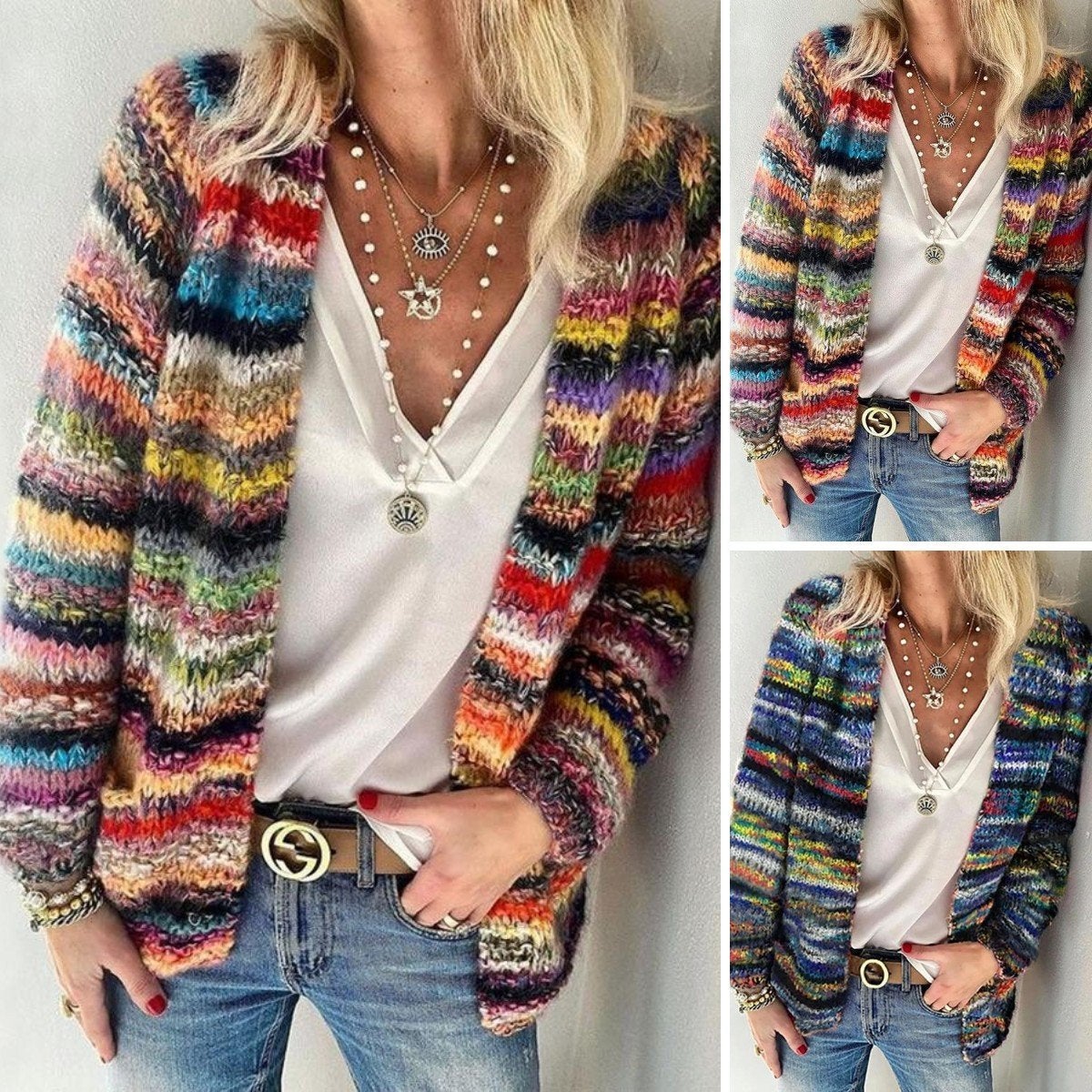 Stay on trend this season in our new casual, collarless cardigan. We especially love the striped fabric and think this piece will be a new favorite in your closet!